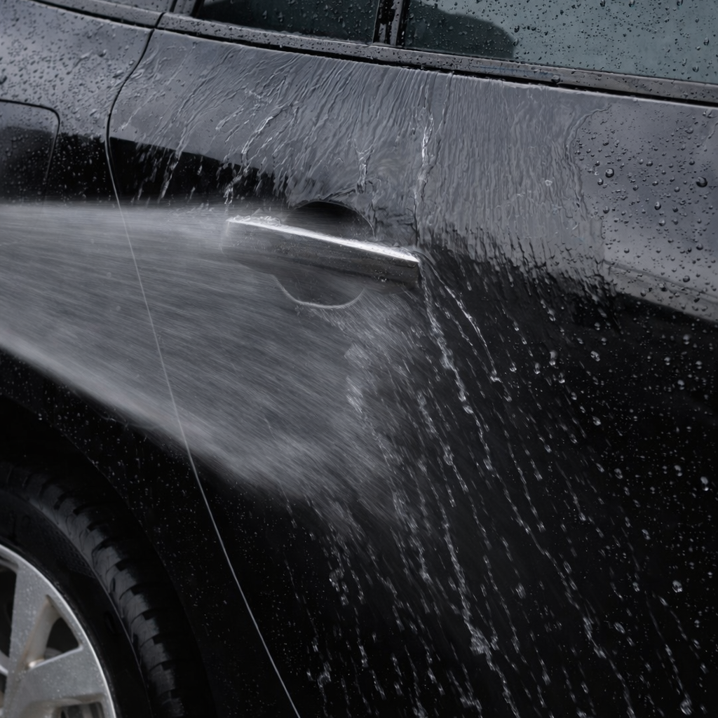 In plaats van een waterfilm vormt zich direct een hydrofobe laag, waardoor water snel afloopt en vuil minder hecht. Het resultaat: een schoner oppervlak en langer behoud van glans.